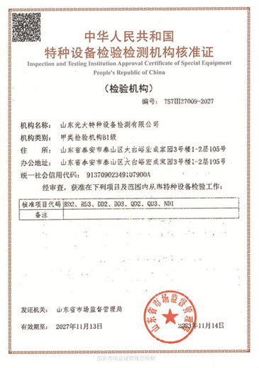 【特種設備檢驗資質和檢驗范圍】 RD2 定期檢驗:第一、二、三類固定式壓力容器(不含超高壓容器,大型高壓者器、球形儲罐) RD3定期檢驗:第一、二類固定式壓力齊器(不含球形儲罐) DD2定期檢驗:公用管道 DD3定用檢:工業管道 QD2 定期檢驗:塔式起重機、流動式起重機,門座式起重機,升降機,纜索式起重機、梔桿式起重機,額定起重量小于 10T(不含10T)的橋式起看機和門式起重機 QD3定期檢驗:流動式起重機,塔式起重機,升降機 ND1定期檢驗:場(廠)內專用機動車...
